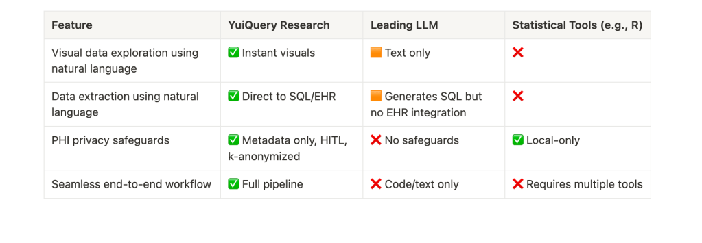 By combining automated data validation, intelligent code generation, guided analytics, and integrated visualization, YuiQuery Research reduces errors, eliminates tool-switching, and accelerates insights — while ensuring compliance and collaboration